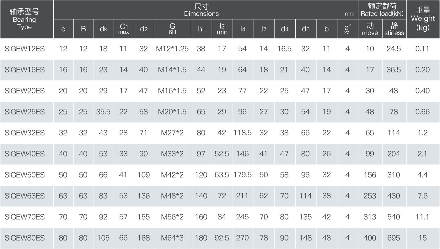 若是左旋螺紋,軸承型號和螺紋標(biāo)記需加“L”和“左”,例如: SILGEW40ES M33*2左-6H。 d≤40以下型號螺紋部分沒有鎖緊螺栓。